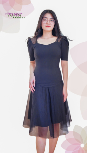 Kiểu dáng: đầm midi tay bồng phối voan, tone màu đen